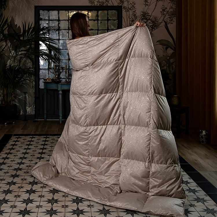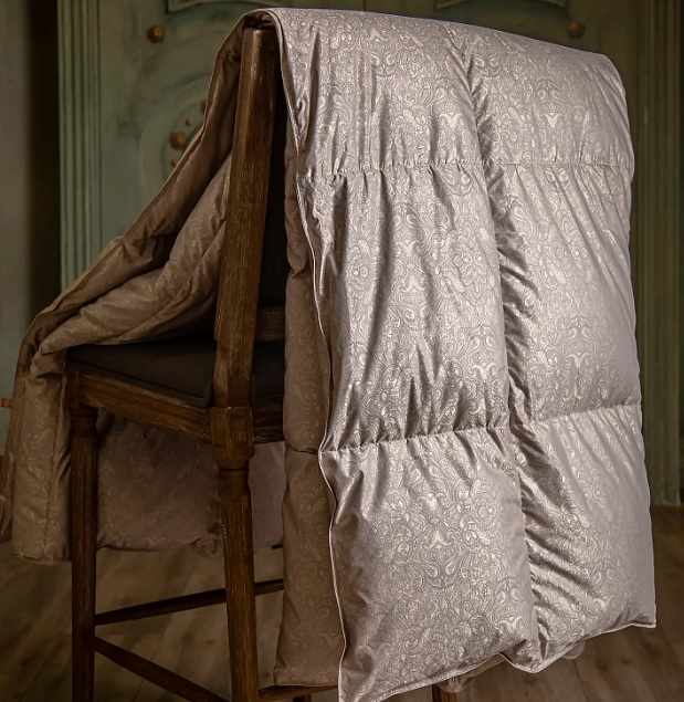 Ткань, изготовленная из хлопка с добавлением полиэфирных волокон, надежно удерживает пух внутри изделий, оставаясь при этом необычайно легкой. Изысканный восточный орнамент благородного золотистого цвета делает изделия из этой коллекции по-настоящему уникальными.